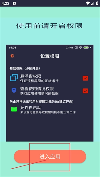在权限开启页面,确认【悬浮窗权限】和【查看使用情况权限】等基础权限都已开启后,点击【进入应用】按钮,即可进入应用主界面。