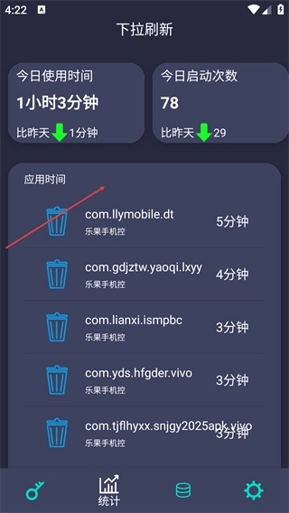 切换到【统计】页面,就能查看【今日使用时间-启动次数】,还有各应用的具体使用时长,从而了解当日设备的使用情况。