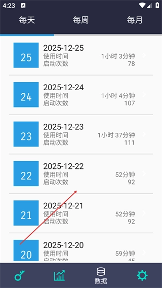 在【数据】页面,能够依据【每日/每周/每月】的维度查看历史使用时长与启动次数,从而掌握设备使用的趋势变动情况。