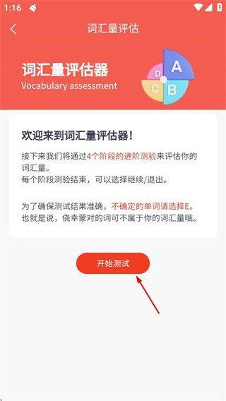 在词汇量评估页面,点击“开始测试”按钮,即可进入词汇量测试环节。