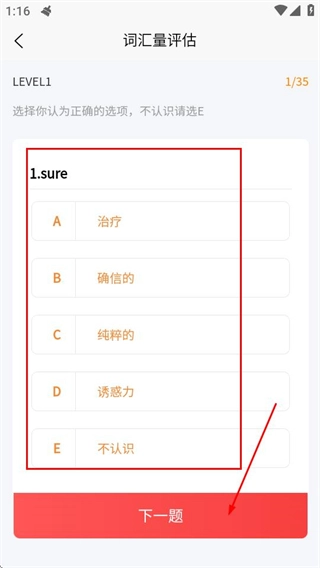 进入美森商务英语后,点击词汇量测试选项,就能进入词汇量评估页面。