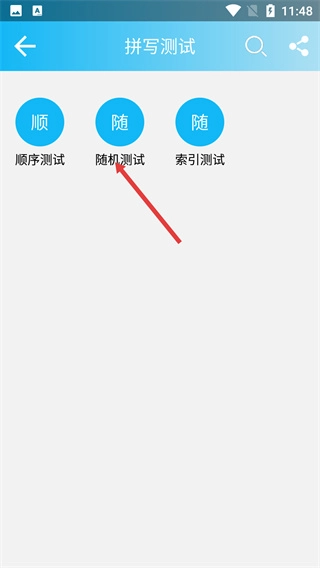 进入【拼写测试】页面后,选择【随机测试】选项,就能开启单词拼写的随机测试模式。