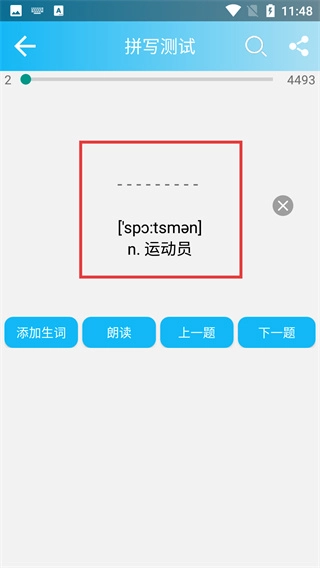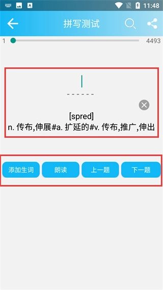 在拼写测试的题目页面,你可以依据音标【[spred]】和对应的释义来填写正确的单词,同时也能使用【添加生词】【朗读】之类的辅助功能。