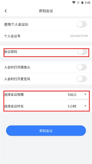 可以设置即刻会议的密码和会议规模,设置好后点击“即刻会议”,把会议密码或者个人会议号发送给需要参加会议的人员就可以了。