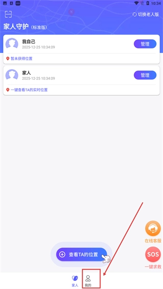 在【家人守护(标准版)】界面中,点击底部导航栏的【我的】选项,就能切换到个人相关功能页面,目前该页面支持查看家人的实时位置信息。