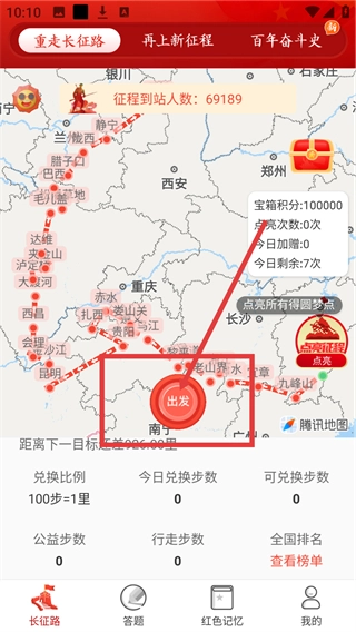 在【重走长征路】页面点击中间的【出发】按钮,即可推进长征征程的进度,同时还能积累步数来兑换里程哦。