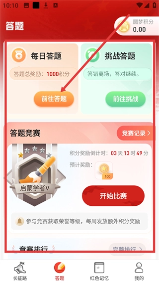 切换到【答题】页面,点击【每日答题】板块下的【前往答题】按钮,即可参与答题并赢取积分奖励。