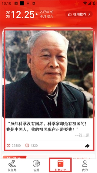 切换至【红色记忆】页面,就能浏览红色人物的事迹(比如【钱三强】的语录),知晓红色历史的相关内容了。