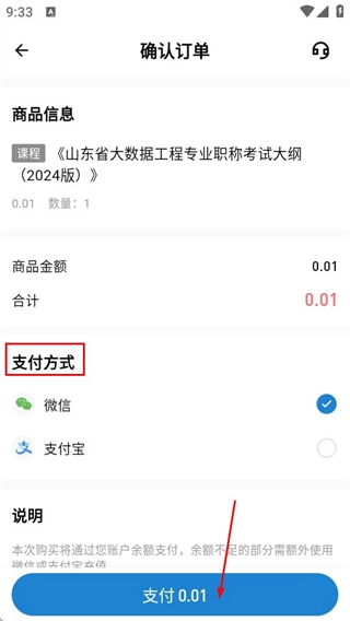 在订单确认页面,选好支付方式并点击支付按钮,就能完成课程的购买。