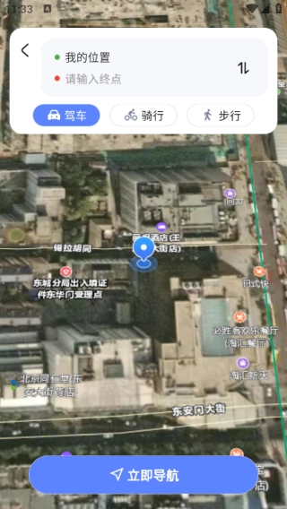 点击导航按钮,输入目的地,接着选择驾车、骑行或步行模式,再点击立即导航。