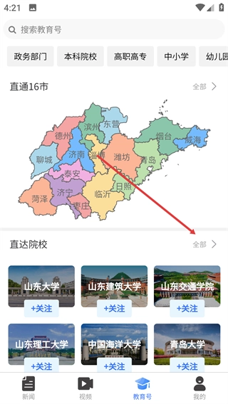 在教育号页面,点击【直达院校】右侧的【全部】按钮,就能进入院校分类查找界面,从而查看更多院校的教育号账号。