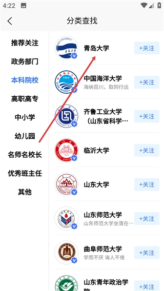 在分类查找界面选择【本科院校】分类,就能筛选出本科类院校的教育号列表,点击目标院校名称即可进入其主页。