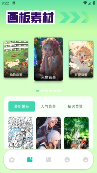 在画板素材页面中包括最新推荐、人气背景和精选背胆识等功能;