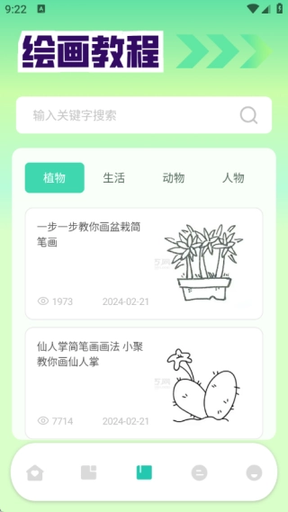 绘画教程页面设有植物、生活、动物、人物等版块,同时支持关键字搜索功能。