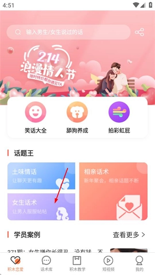 进入积木恋爱话术界面后,找到话题王板块,点击其中的女生话术选项,就能进入女生话术专区页面。
