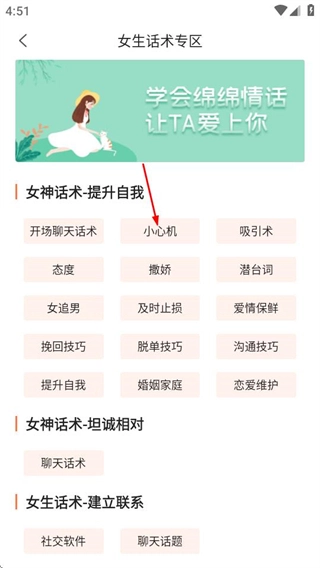 在女生话术专区页面,选择“小心机”选项,就能进入对应的小心机内容页面。