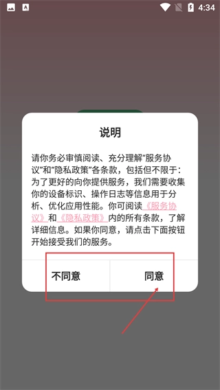 在仔细阅读【服务协议】和【隐私政策】的具体说明后,点击页面上的【同意】按钮,就能顺利进入应用并使用它的各项功能了。