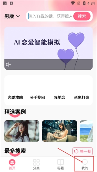 在AI恋爱智能模拟的首页,点击底部导航栏的【我的】按钮,即可进入个人功能相关页面。