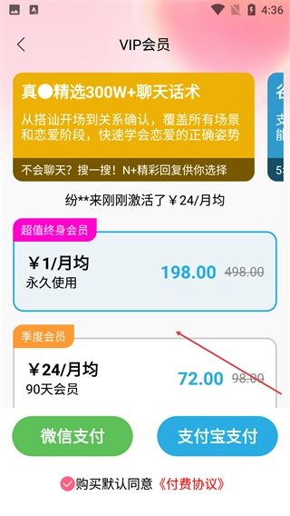 在VIP会员页面,您可以选择【超值终身会员】【季度会员】等套餐,并通过微信支付或支付宝支付来完成会员开通流程。