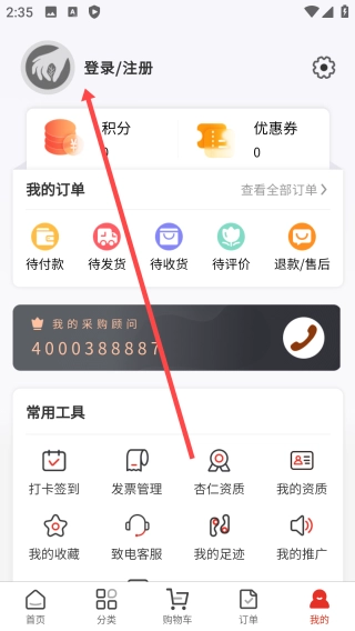 进入我的页面以后,点击【登录/注册】
