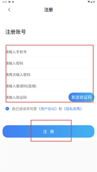 进入注册页面后,按顺序填写手机号、密码、验证码等相关信息,勾选对应的协议条款,然后点击【注册】按钮,即可完成账号的创建。
