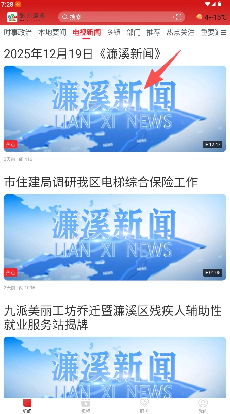 在栏目区选择“电视新闻”浏览近期视频资讯。