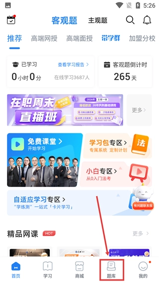 在主页面底部,点击【题库】按钮切换至题库板块。