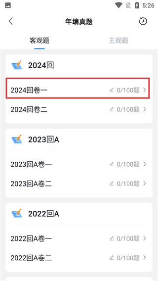在年编真题页面,选择【2024回卷一】真题卷,该试卷有0/100题待练,点击即可进入对应的答题环节。