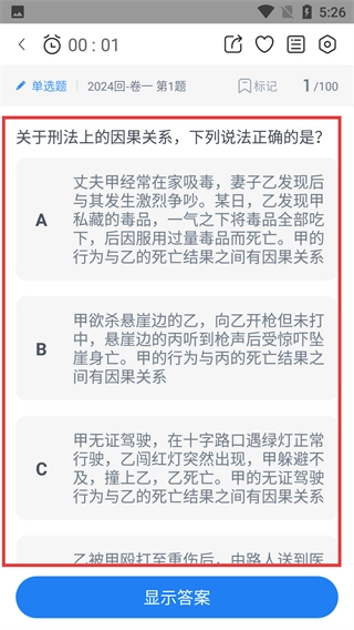 进入答题界面后,你可以作答【2024回-卷一第1题】这道单选题,选好答案后,点击【显示答案】按钮就能看到该题的详细解析了。