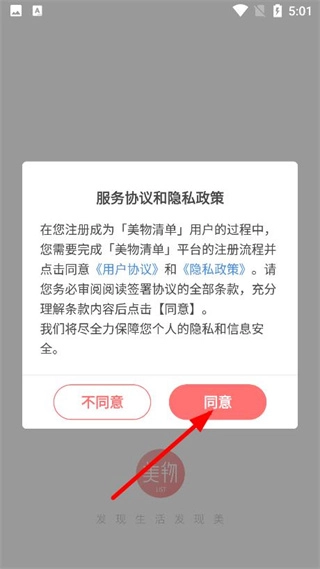 在【服务协议与隐私政策】的弹窗里,点击【同意】按钮,就能继续完成【美物清单】的注册步骤。