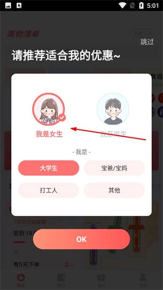 在优惠推荐弹窗里,挑选相应的性别选项(例如【我是女生】)和身份选项(例如【大学生】),选好之后点击【OK】按钮。
