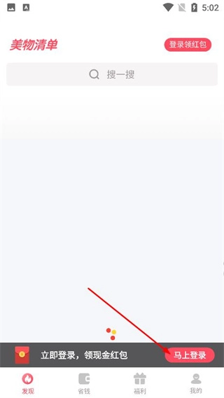 进入【美物清单】首页后,点击底部【立即登录-领现金红包】旁边的【马上登】按钮,就能进入登录流程参与红包领取。