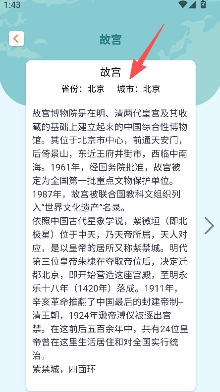 点击对应的景点,就能查看该景点的地域信息和详细介绍。