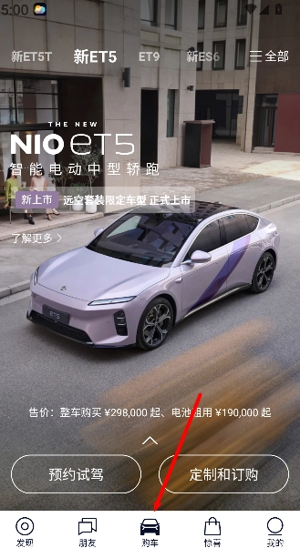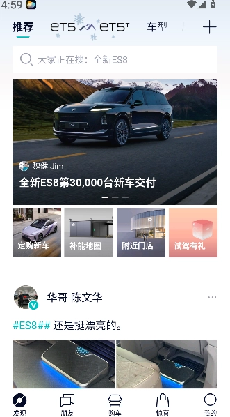 进入蔚来软件首页后,能够浏览系统推荐的新车型相关信息,查看车型的外观展示、核心亮点以及详细的介绍内容。