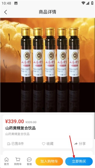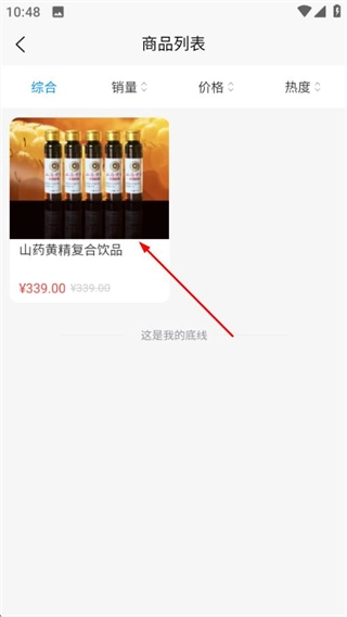 在商品列表页面,点击“山药黄精复合饮品”即可进入该商品的详情页面。