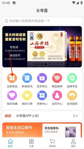 在长寿露首页,点击全部商品选项进入分类页面。