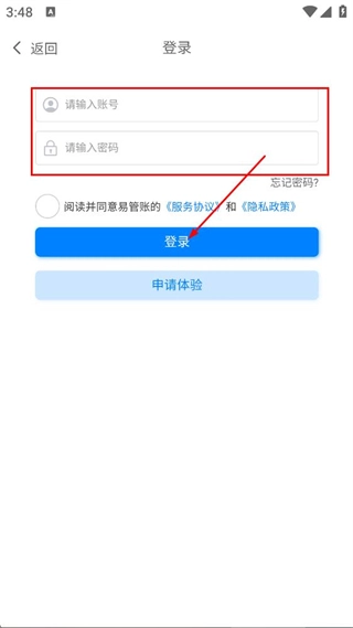 在登录页面,输入账号与密码,点击登录按钮,即可完成账号的登录操作。