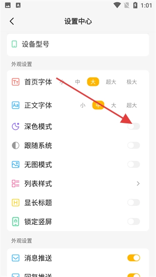在设置中心的“外观设置”板块,打开“深色模式”的开关,即可切换到深色界面风格。
