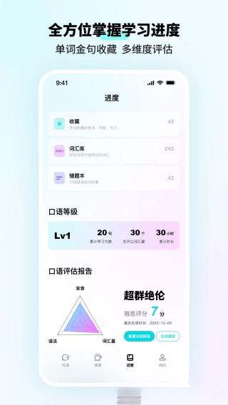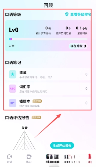 强大的回顾系统让用户的学习进展一目了然,既能实时查看口语等级评定和累计学习时长,也能借助等级排行榜与其他学习者一较高下。这种可视化的成长路径与良性竞争环境,会不断点燃你的学习动力,让你始终保持坚持的热情。