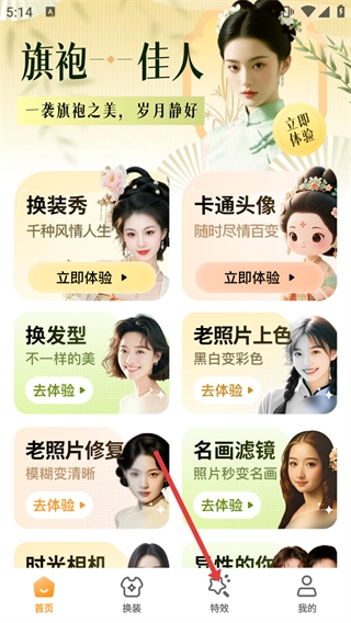 在【旗袍--佳人】界面,点击底部的【特效】按钮,进入特效功能页,可查看【换装秀】-【卡通头像】等多种美化功能。