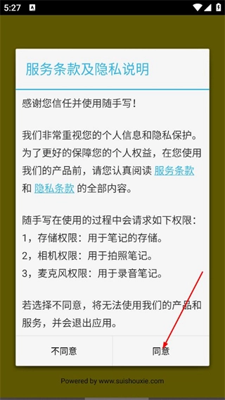 在随手写弹出的服务条款与隐私说明窗口中,点击同意按钮后,即可进入主页面。