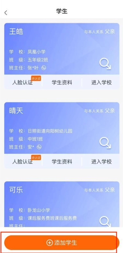 显示学生姓名、学校、班级、班主任等信息,点击【添加学生】可添加多个学生。