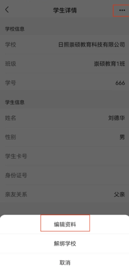 若要修改学生信息,可按以下步骤操作:首先点击【学生资料】进入学生详情页面,接着点击右上角的三个点图标,选择【编辑资料】选项,即可对学生姓名、性别、学生卡号、身份证号、亲友关系及学号进行修改。