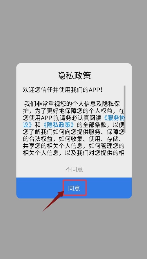 应用启动时会弹出协议窗口,点击同意按钮就能进入功能界面。