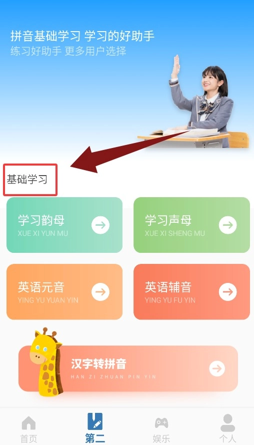 在基础练习区,你可以学习拼音的声母、韵母,也能练习英语元音和辅音的发音。