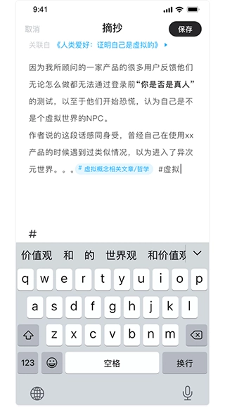 ●选择文章中的内容后,点击摘抄按钮就能生成对应的摘抄内容,在此基础上还可以补充自己的思考、添加标签。另外,也支持通过点击或输入 # 的方式添加标签,输入 “/” 则能用来标记标签的层级关系。