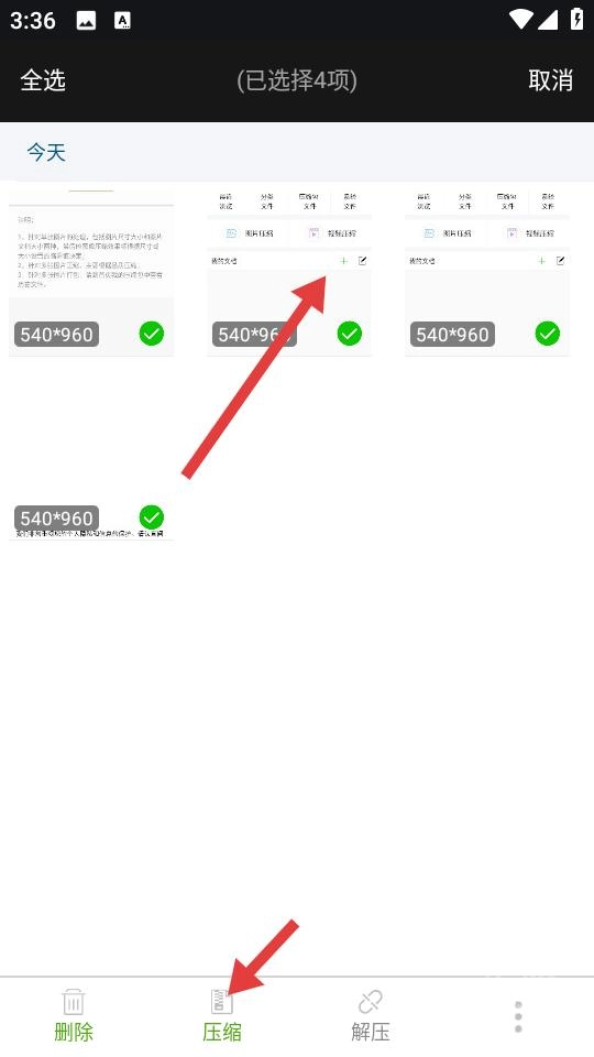文件管理界面显示已选中4个文件,缩略图旁边的绿色勾选标记表示选中状态,底部的压缩按钮设计醒目,便于进行批量处理操作。