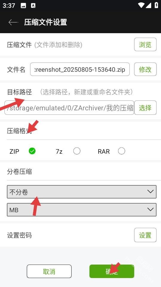 在压缩设置界面中,用户能够编辑文件名并选择文件的存储路径;压缩格式提供了ZIP等多种选项可供挑选;分卷压缩功能默认设置为不分卷模式;界面底部的确定按钮,可协助用户对各项参数进行细致的配置与确认。