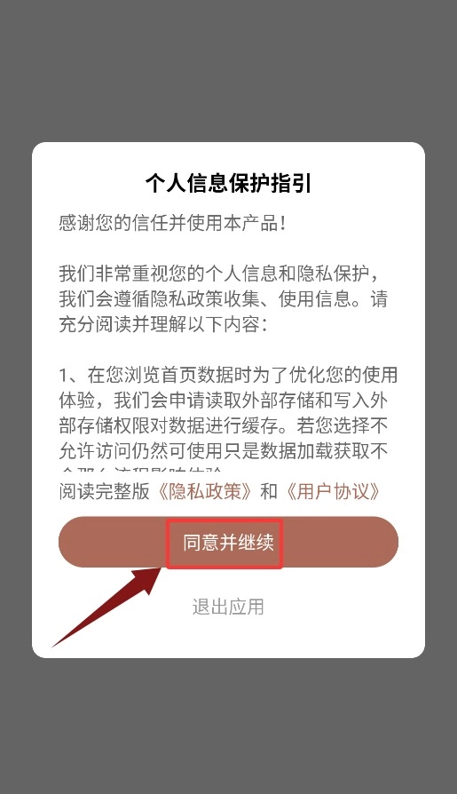 首次打开应用时,需要点击“同意并继续”按钮,确认后才能进入主界面。