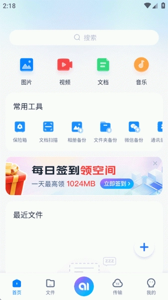 打开360AI云盘后,首页的常用工具区域配备了文档扫描、相册备份、文件夹备份等实用功能。